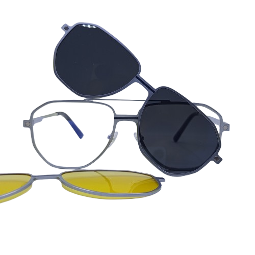 Cuatro lentes en uno, al armazón con tu graduación le agregas los clips para protegerte del sol y con el clip amarillo evitas encandilarte con las luces de los autos.